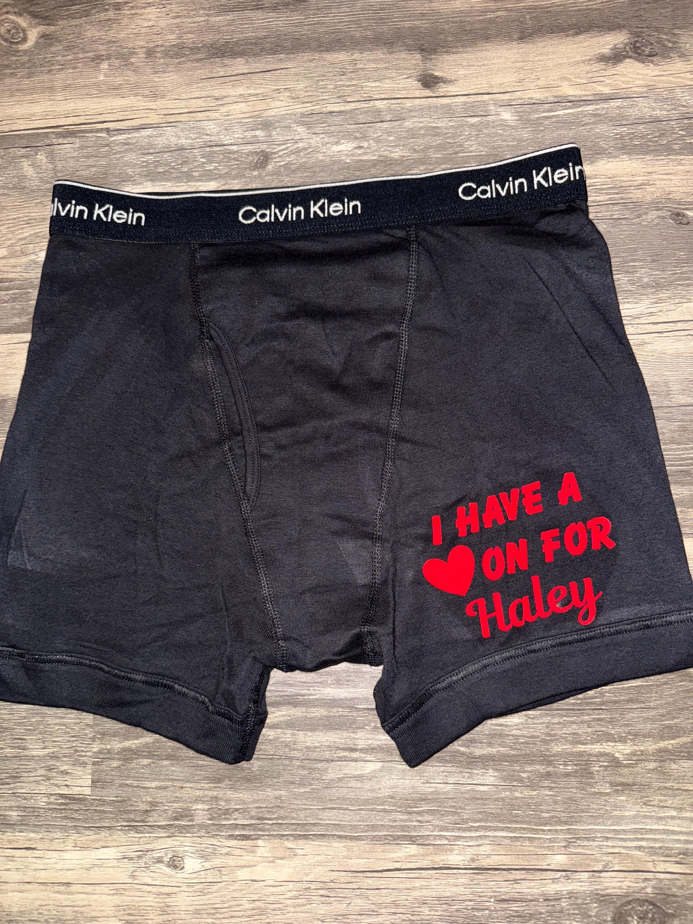 I have a heart on for Calvin Klein black personalized boxer briefs.